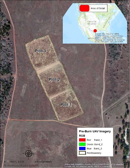 The location of the research prescribed burns are shown in Figure 1. An open field consisting of various grass and fob species was divided into three plots of roughly equal size. This field is heavily managed with fuels changing dramatically from year to year. Consequently, acquisition of timely imagery was a necessity to correctly map the fuels on the study site. Fuels were mowed around the edge of each of these plots as shown in Figure 1. Plot 1 is a roughly 1.2 hectare plot with sides of length equal to approximately (plot sides are not exactly straight lines with length being measured from plot corner to plot corner on georectified imagery described below) 109 meters on the east side, 105 meters on the north side, 100 meters on the west side and 111 meters on the south side. Plot 2 is a roughly 1.2 hectare plot with sides of approximate length of 109 meters on the east side, 110 meters on the north side, 103 meters on the west side and 108 meters on the south side. Plot 3 is a roughly 1.2 hectare plot with sides of length 111 meters on the east side, 108 meters on the north side, 105 meters on the west side and 106 meters on the south side. Lengths were measured from georectified imagery and not orthorectified imagery and consequently do not represent true distances.